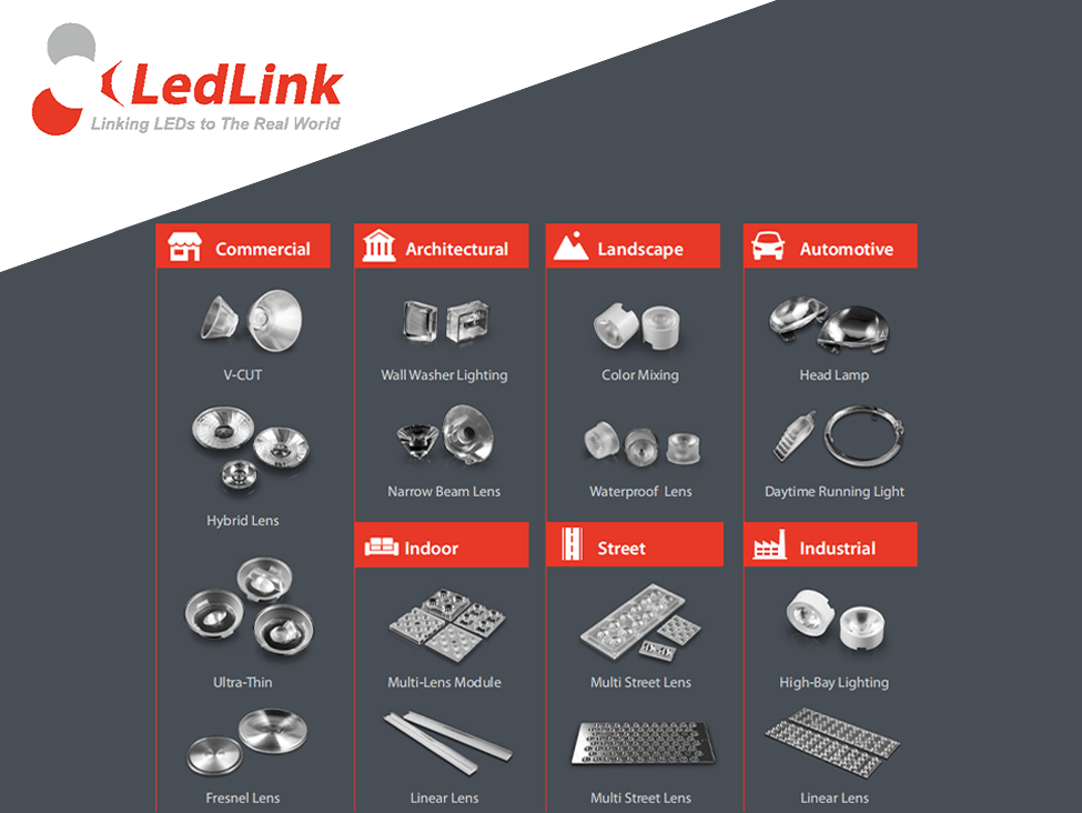Ledlink Optics Inc., founded in 2008 in Taiwan, is a company specializing in the design and manufacture of secondary optical lenses for LEDs. Its lens products cover a wide range of beam angles, sizes, and package types, and are widely used in residential, commercial, street, and architectural lighting applications.