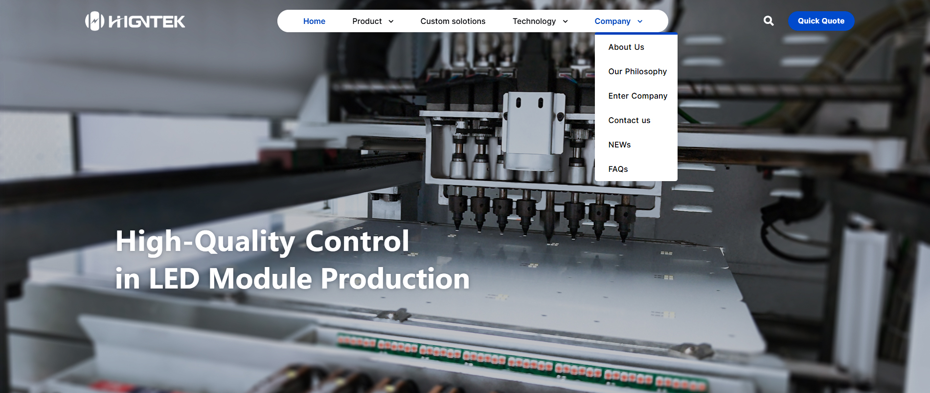 The Higntek website includes key sections such as Home, Product Center, Module Customization, Technology Resources, News, About Us, and Contact Us. It provides an in-depth view of the company’s LED module R&D, manufacturing capabilities, and integrated supply chain solutions, allowing users to access the information they need quickly and efficiently.